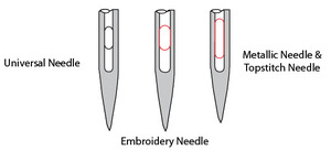 icon The most popular needle, the Universal, has an eye that is 40% the width of the blade. Really! There are three other needles with larger eyes, the Embroidery and even more pronounced is the elongated eye of the Metallic and Topstitch needles. Now what does a larger eye mean? There is less friction on the thread as it passes through the eye. Ever sew with a thread that breaks or tends to shred? Guess what, use a needle with a larger eye. If you have old thread or maybe a poor quality thread, use a needle with a larger eye. The thread and needle work hard and fast. Help them out when you can with a larger eye.