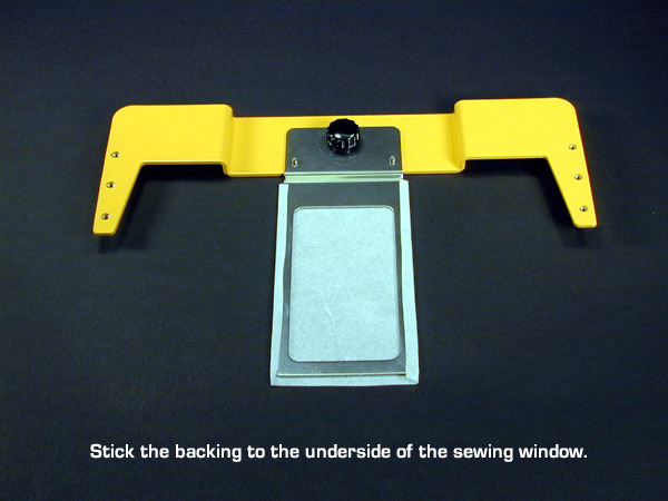 The Quick Change sewing windows are designed to be used with peel and stick, or water activated, sticky backing. The sticky backing is applied to the underside of the window with the sticky side up. The fabric to be embroidered is pressed down on the sticky side and is held in place during sewing. After the design is complete, just tear away the backing from the window, patch the hole with another piece of peel and stick, and your ready for the next design.