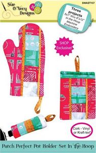 The Patch Perfect Pot Holder Set In the hoop comes in 10 different machine embroidery formats ART-DST-EXP-HUS-JEF-PES-SHV-VIP-VP3- XXX on a CD and coordinates perfectly with the Patch Perfect Apron and Towel Topper, SWAST108.